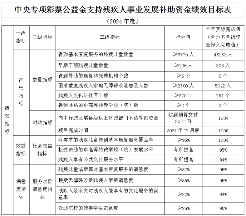 對照殘疾人事業(yè)發(fā)展補助中央轉(zhuǎn)移支付資金2024年度績效總體目標,我省已全部完成,具體情況如下:1.通過實施殘疾兒童康復(fù)救助,年度內(nèi)為超過4.6萬名殘疾兒童提供人工耳蝸手術(shù)、肢體矯治手術(shù)、輔具適配、功能訓(xùn)練等服務(wù),顯著改善兒童功能狀況,增強自理和社會參與能力,實現(xiàn)“應(yīng)救盡救”。為試點地區(qū)308名小齡殘疾兒童提供親子同訓(xùn)、家長培訓(xùn)等以家庭為中心的早期干預(yù)康復(fù)服務(wù)。2.通過為6家殘疾人康復(fù)和托養(yǎng)機構(gòu)配置設(shè)施設(shè)備,提升了殘疾人機構(gòu)服務(wù)能力。3.通過實施251個殘疾人文化進社區(qū)項目,使殘疾人就近就便參加文化活動,豐富了精神文化生活,提升了社會參與度和生活質(zhì)量,增強了獲得感和使命感。4.通過資助2個中高等特殊教育學(xué)校(院),學(xué)校的辦學(xué)條件得到優(yōu)化,硬件設(shè)施不斷完善,教師素養(yǎng)得到提高,殘障學(xué)生的受教育條件有效改善,服務(wù)對象滿意度有效提升。5.通過為5042戶困難重度殘疾人家庭進行無障礙改造,充分考慮不同類別殘疾人家庭對無障礙設(shè)施設(shè)備的改造需求,基本滿足了殘疾人居家生活需要。